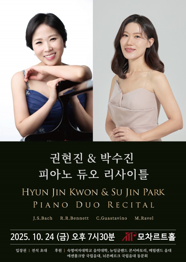 공연안내 본문 공연명 권현진 & 박수진 피아노 듀오 리사이틀 공연일자 20251024 공연시간 19 시 30 분 공연장소 모차르트홀 공연주최 공연가격 전석 초대 공연문의 공연내용 목록