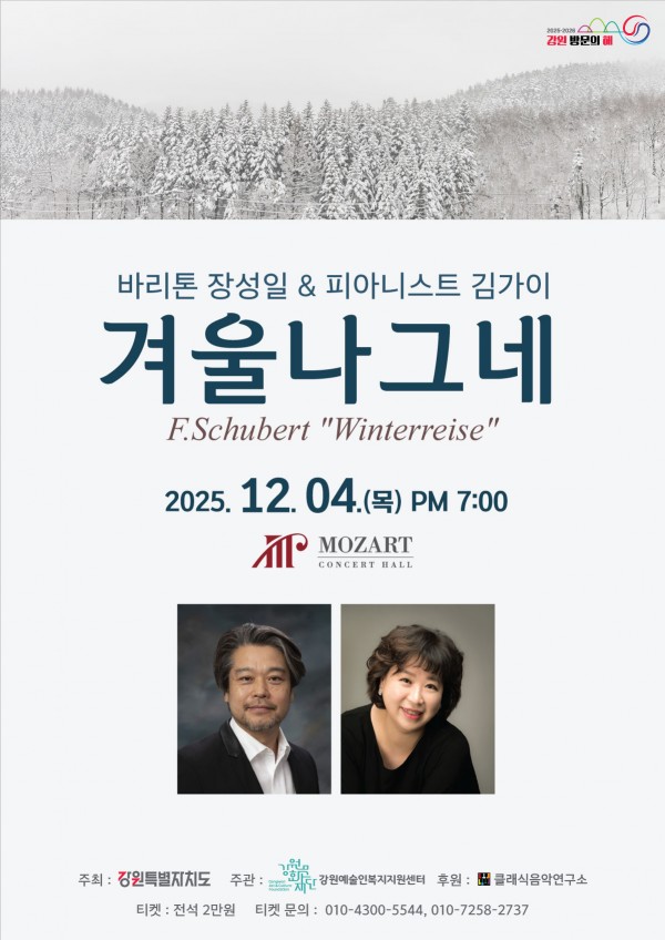 공연안내 본문 공연명 오스트리아로 떠나는 음악여행 2 공연일자 20251204 공연시간 19 시 30 분 공연장소 모차르트홀 공연주최 강원도 특별자치도 .강원 예술인복지지원센터.강원 방문의해.클래식 음악연구소 공연가격 전석 2만원 공연문의 010-4300-5544, 010-7258-2737 공연내용 오스트리아로 떠나는 음악여행 2 목록