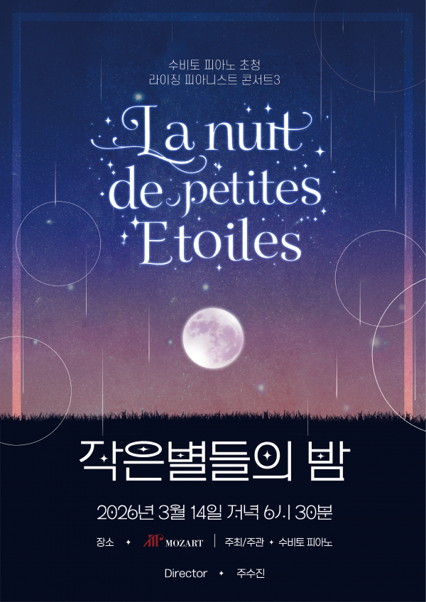 본문 공연명 작은 별들의 밤 (3) 공연일자 20260314 공연시간 18 시 30 분 공연장소 모차르트홀 공연주최 수비토피아노 공연가격 전석 초대, 만 5세 이상 관람가 공연문의 공연내용 목록