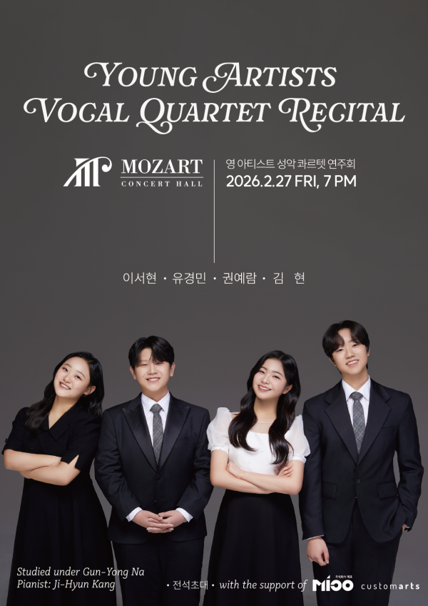 공연안내 본문 공연명 영 아티스트 성악 콰르텟 연주회 공연일자 20260227 공연시간 19 시 공연장소 모차르트홀 공연주최 공연가격 공연문의 공연내용 영 아티스트 성악 콰르텟 연주회 목록