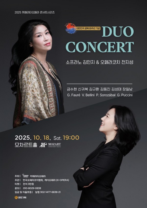 본문 공연명 DUO CONCERT 소프라노 김민지 & 오페라코치 전지성 공연일자 20251018 공연시간 19 시 공연장소 모차르트홀 공연주최 까메라타오페라/케이오페라(K-OPERA) 공연가격 전석 3만원 공연문의 010-8029-0838 공연내용 목록
