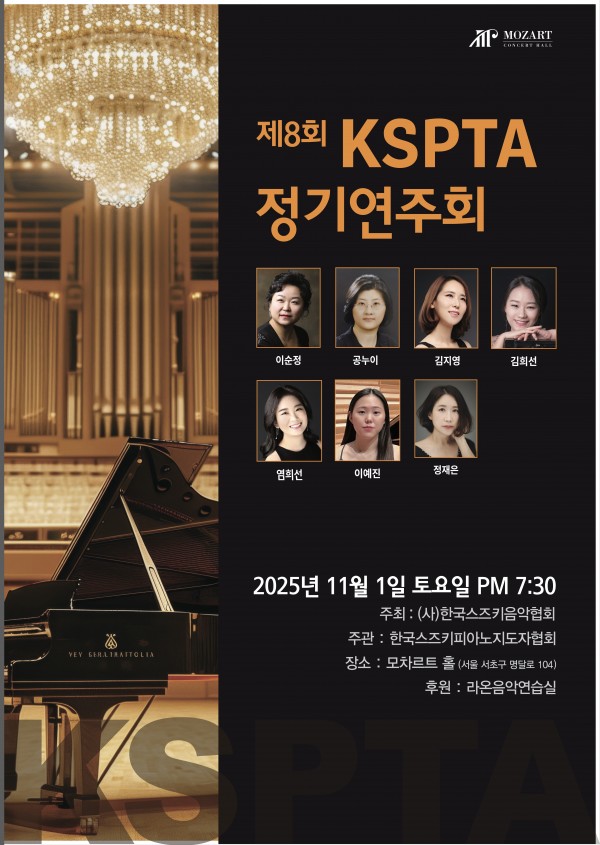 본문 공연명 제8회 KSPTA 정기연주회 공연일자 20251101 공연시간 19 시 30 분 공연장소 모차르트홀 공연주최 주최: (사)한국스즈키음악협회 / 주관: 한국스즈키피아노지도자협회 공연가격 공연문의 공연내용 . 목록