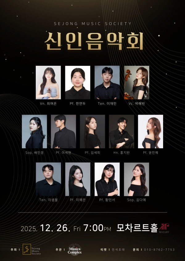 본문 공연명 세종뮤직소사이어티 신인음악회 공연일자 20251226 공연시간 19 시 공연장소 모차르트홀 공연주최 세종뮤직소사이어티 공연가격 전석 초대 공연문의 010-8762-7753 공연내용 목록