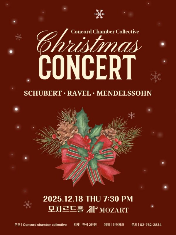 본문 공연명 크리스마스 실내악 콘서트 with Concord Chamber Collective 공연일자 20251218 공연시간 19 시 30 분 공연장소 모차르트홀 공연주최 Concord Chamber Collective (후원 한국예술종합학교 동문회) 공연가격 전석 2만원 공연문의 공연내용 목록
